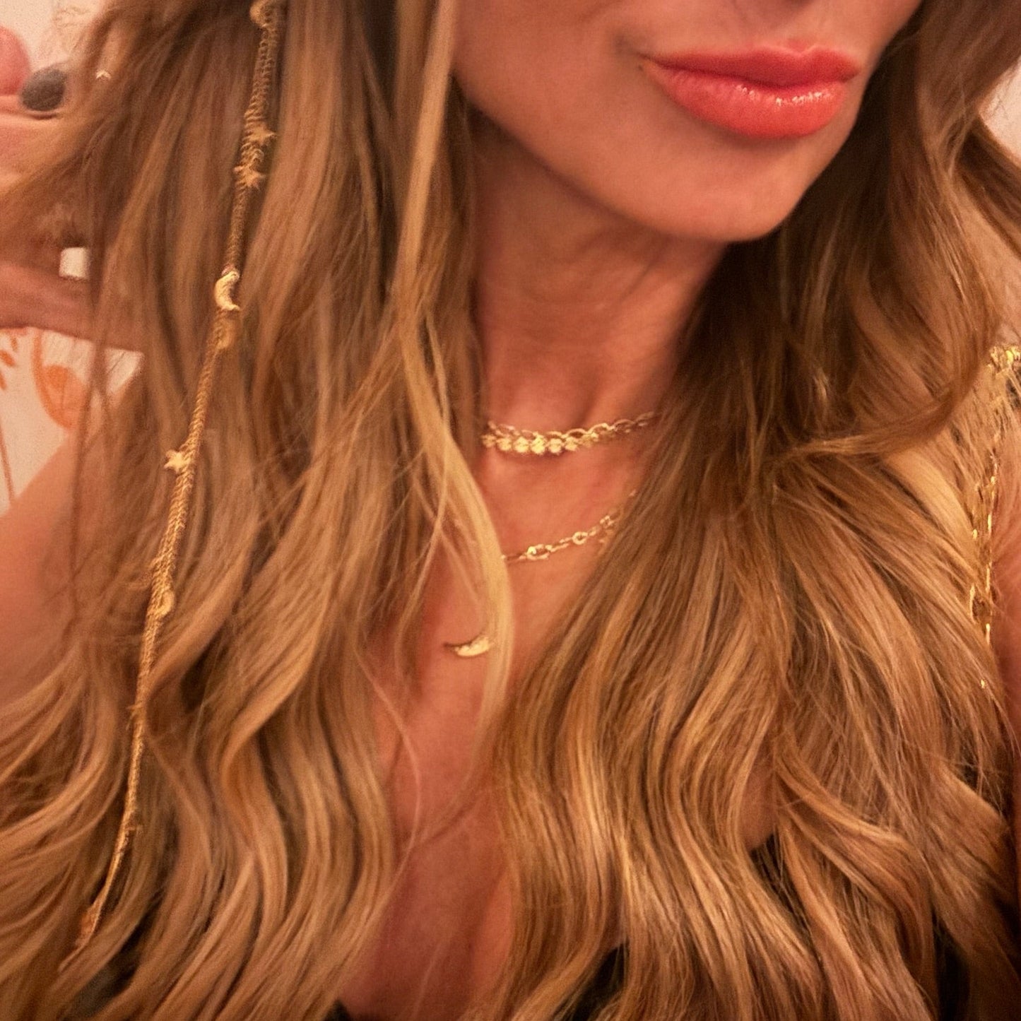 Green bikini top with gold necklaces and pearl accents including a Payton Best seller the Allure adjustable drop necklace.