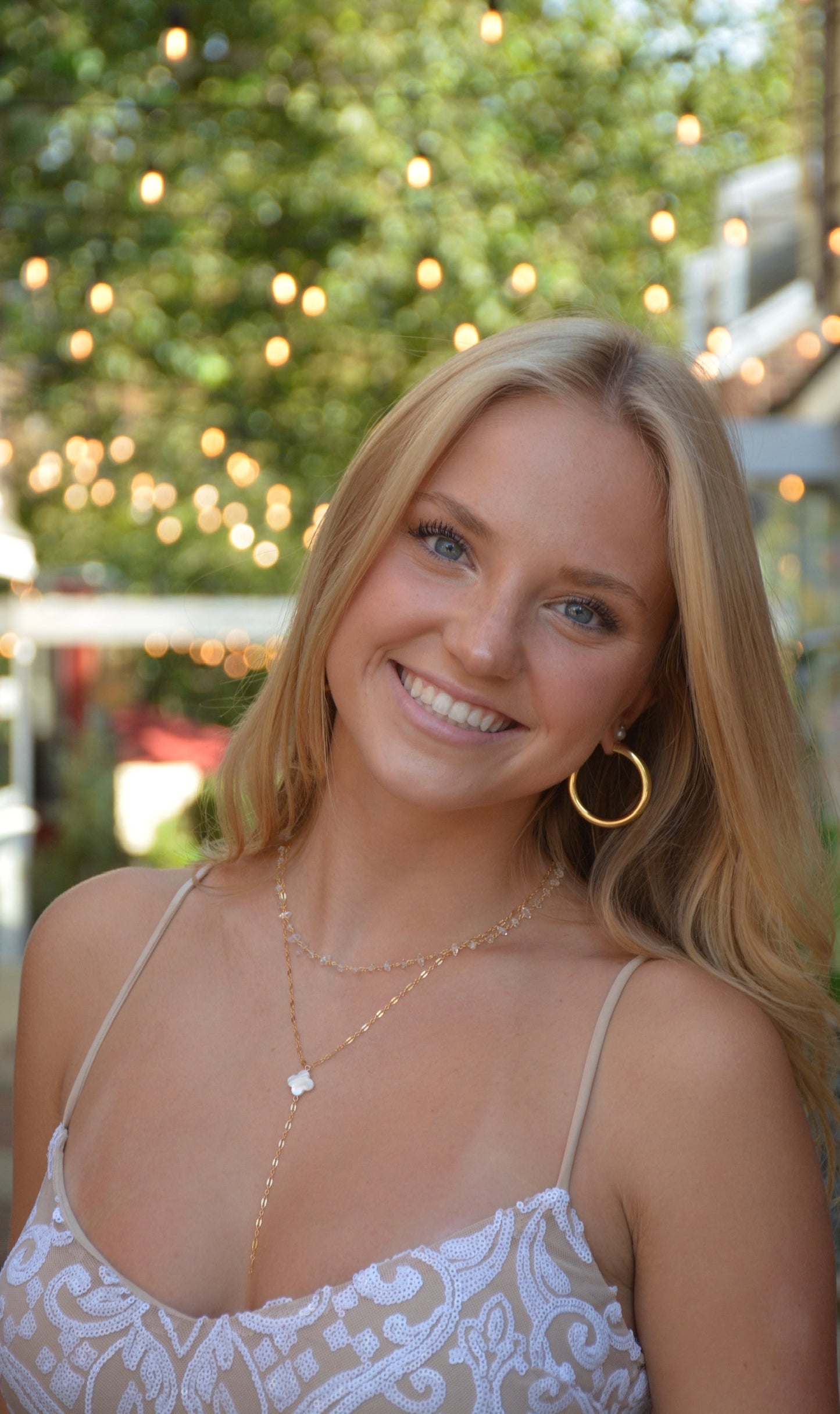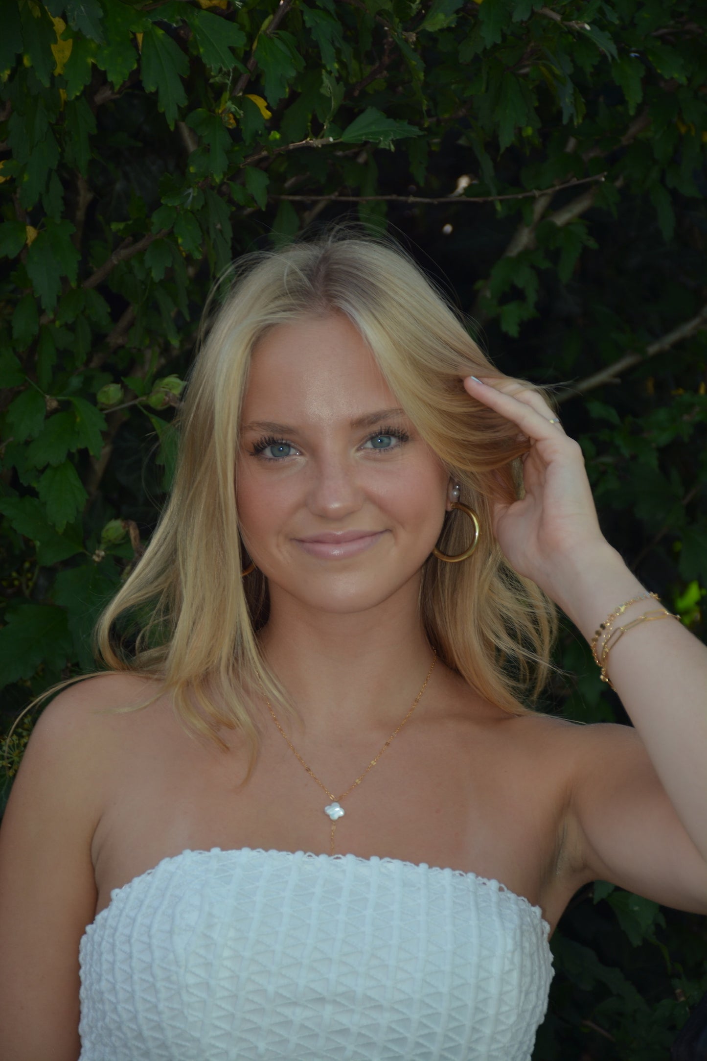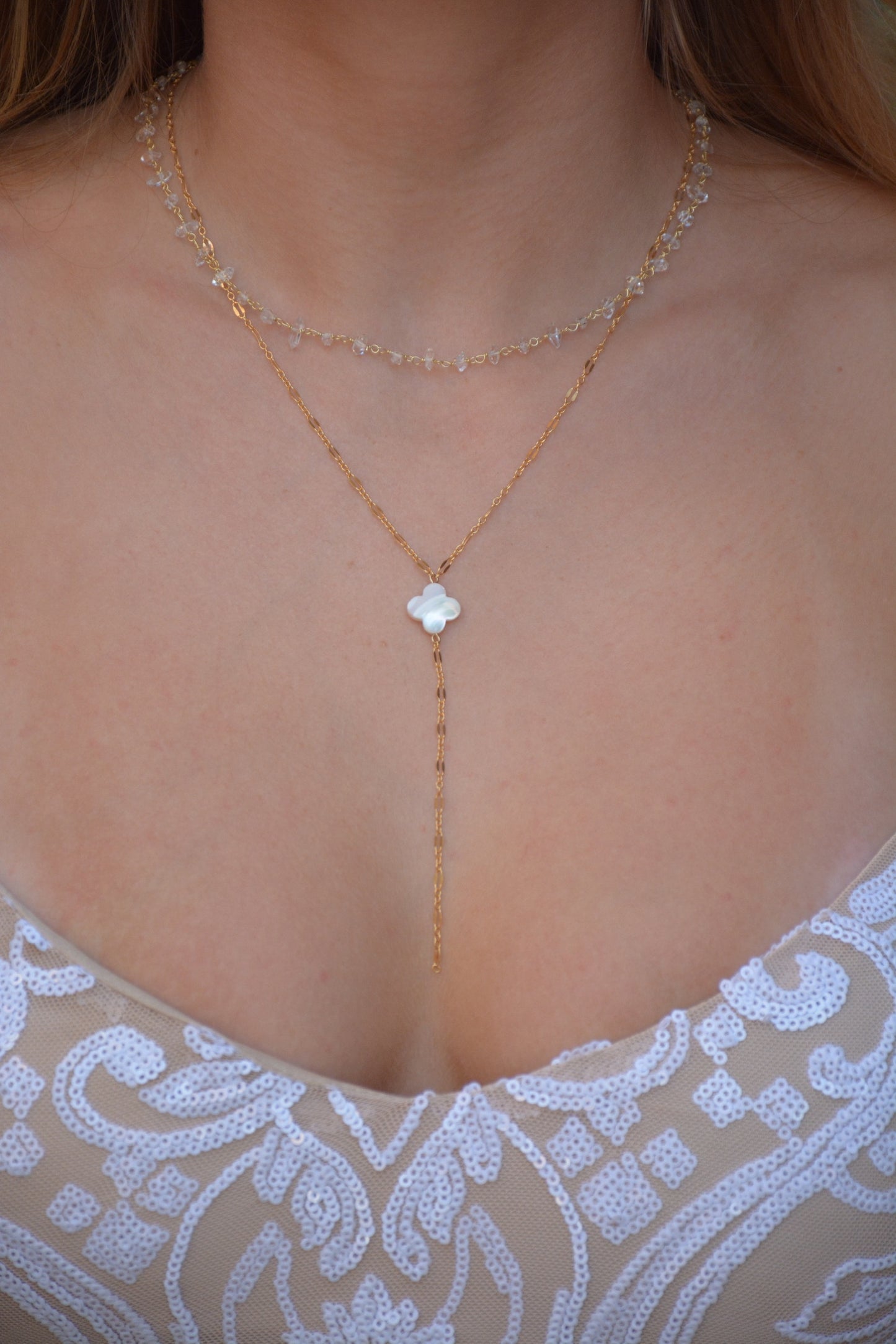 Our "Clover Drop Necklace" is a lovely and elegant piece of jewelry that combines the symbolism of the clover with the timeless beauty of gold and the iridescent allure of mother-of-pearl.