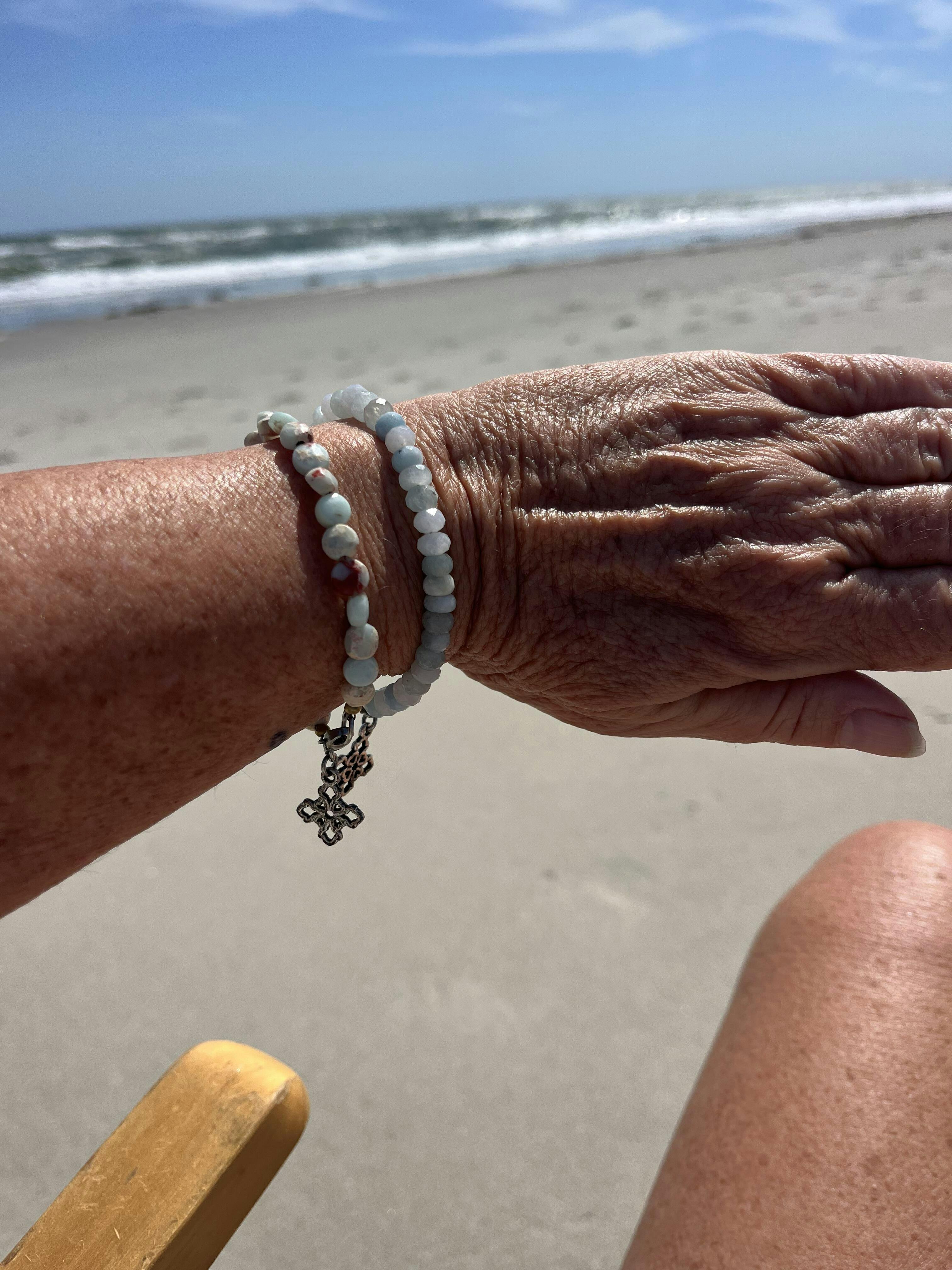 Say hello to our Summer Nights Stacker! is the perfect unique and sparkly stone bracelet, consisting of Morganite, Aquamarine, Moonstoneand Purple Opal stones. Wear this bracelet for a beautiful pop of color to match any outfit.