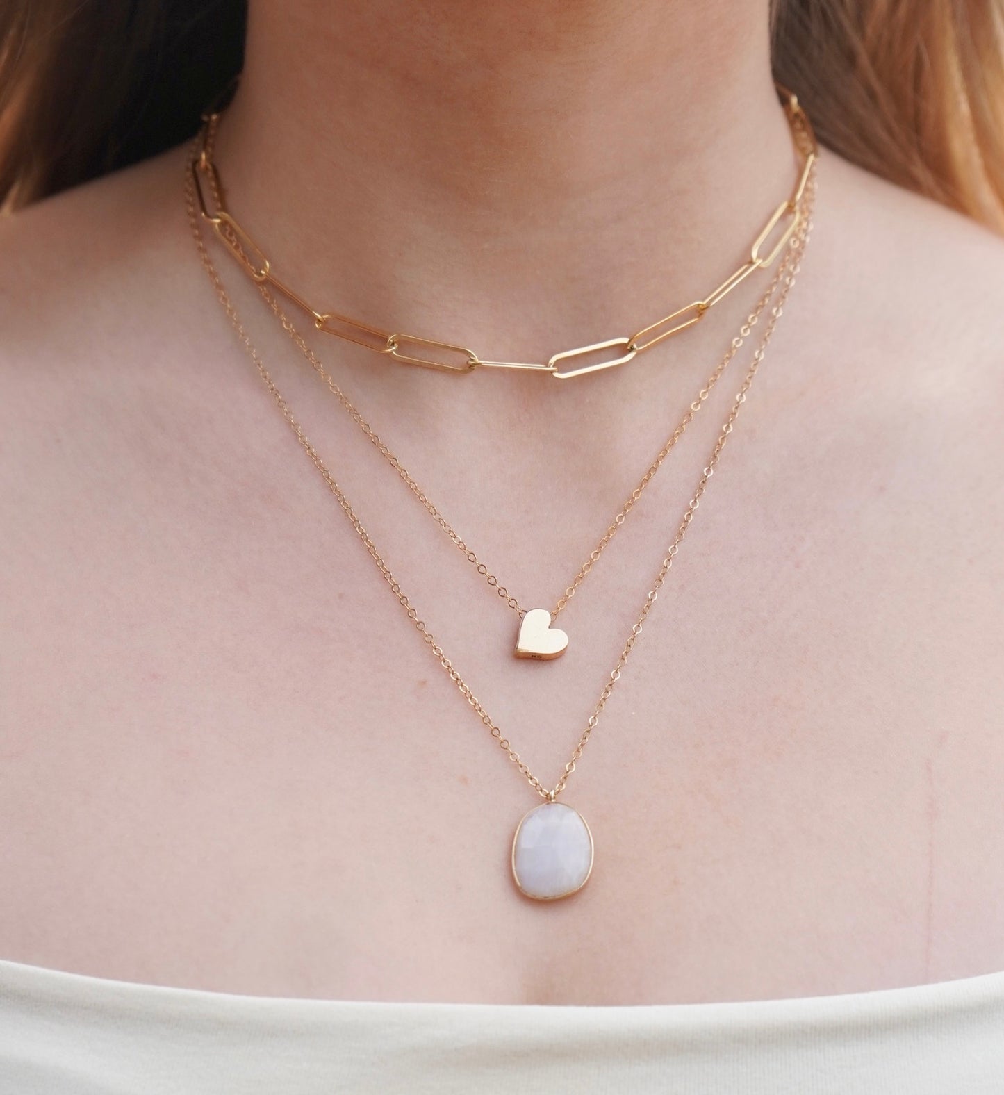 Our stunning Moonbeam Necklace features a gorgeous Moonstone bezel to give you an unforgettable look. This piece is sure to be a show-stopper!
