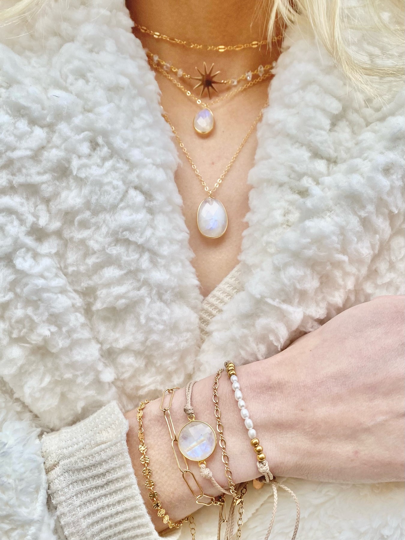 Our stunning Moonbeam Necklace features a gorgeous Moonstone bezel to give you an unforgettable look. This piece is sure to be a show-stopper!